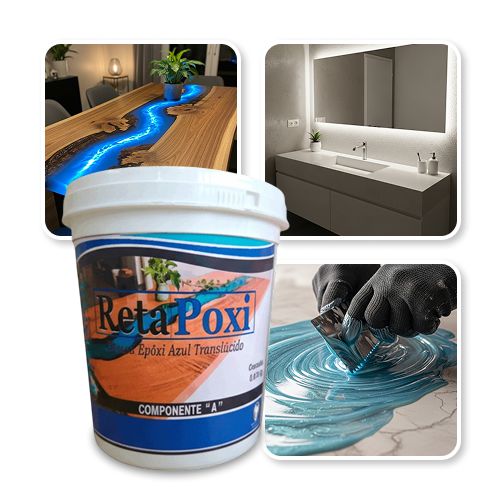 A Retapoxi Translúcida se adapta com facilidade a diferentes projetos e superfícies, como madeira, MDF, granito e mármore. É ideal para mesas River Table, móveis personalizados e peças decorativas que exigem um acabamento visual sofisticado. Sua tonalidade azul translúcida, combinada à resistência e ao brilho vítreo, permite aplicações tanto em ambientes residenciais quanto comerciais, com alto padrão estético e durabilidade.